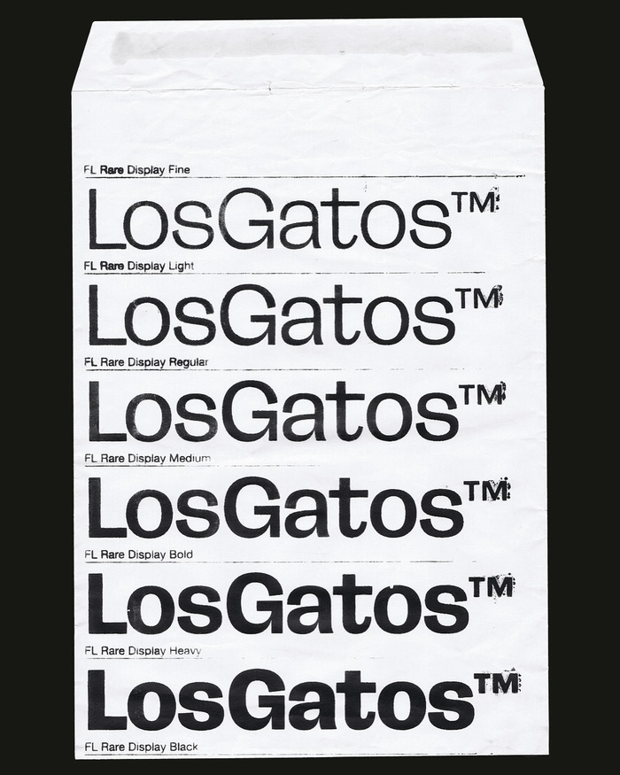The different weights of the typeface connected perfectly with the screen printing technique, the use of more or less ink and the resulting texture, from the lightest weight (FL Rare Display Fine) to the boldest (FL Rare Display Black), passing through all the intermediate ones. That’s why we reached out to Serigrafia Los Gatos to share this idea of an identity-specimen.