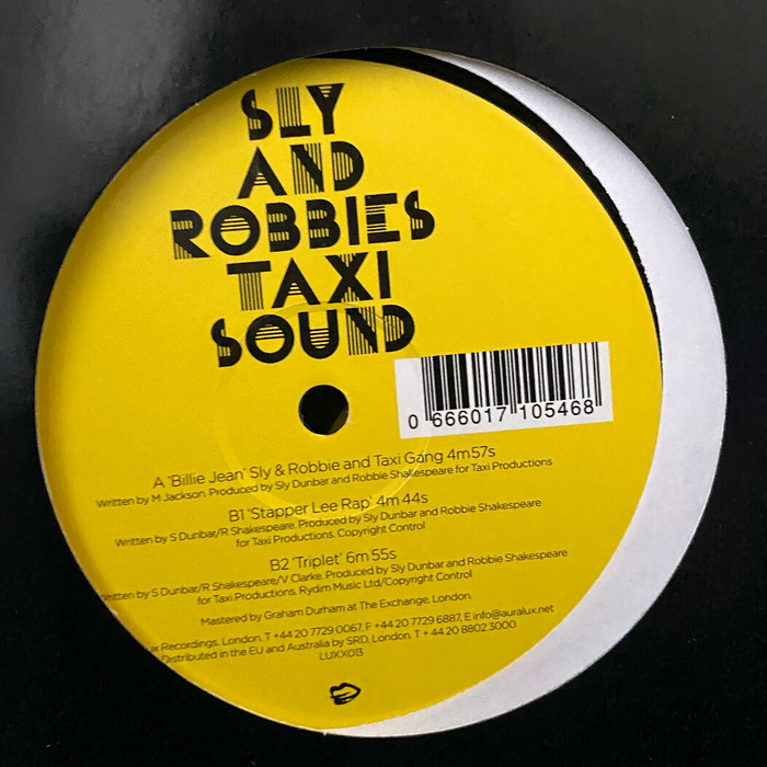Shown here is the CD cover and a vinyl record label for Sly and Robbie’s Taxi Sound. This compilation album was released in 2005 on Marcus Weedon’s Auralux Records, marking the thirtieth anniversary of Sly & Robbie’s own label, Taxi Records. The Art Deco caps with stripe pattern are based on A.M. Cassandre’s Bifur, with a few changes: compared to the 1928 original, S got a wider base and Y a second arm, the middle part of B was made longer, X has solid diagonals on the right as well, and U was widened.
