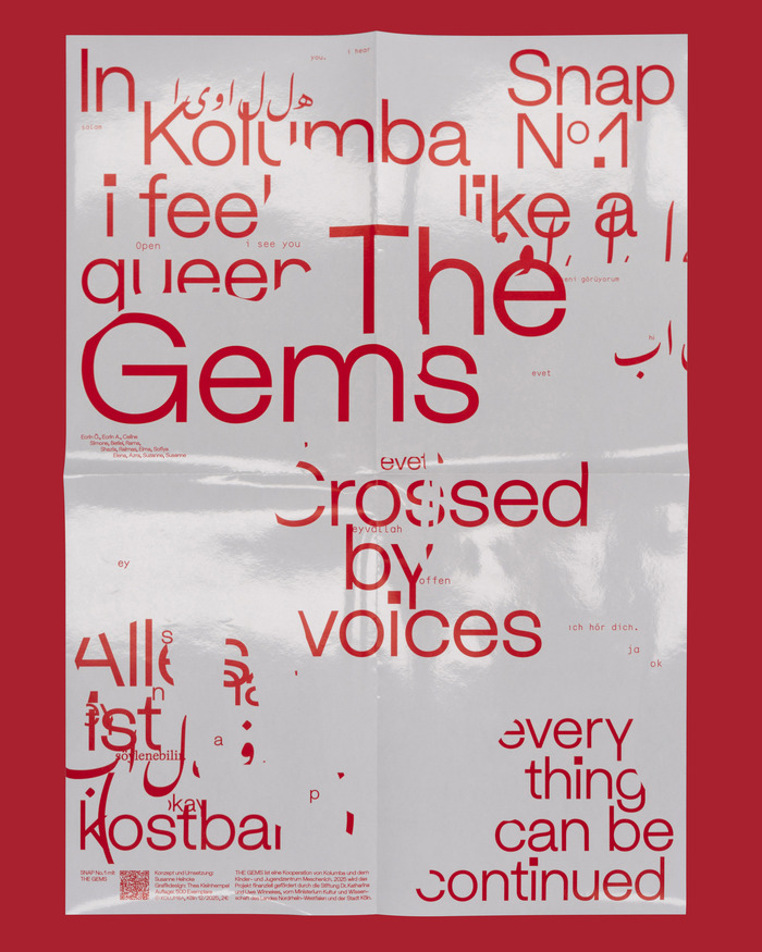 The program is a collaboration between Kolumba Museum Cologne and the Kinder- und Jugendzentrum Meschenich. Snap No. 1, Dec. 2025, “The Gems” is an edition of 500 copies. The concept was developed by Susanne Heincke.