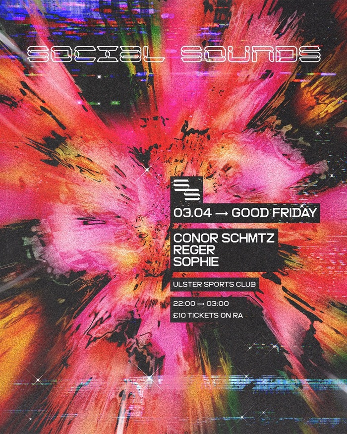 Social Sounds returns on bank holiday Good Friday at Belfast’s Ulster Sports Club, featuring Conor Schmtz, Reger, and Sophie. The poster features Animo by Heavyweight.