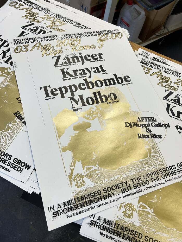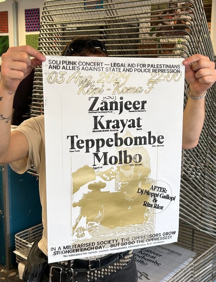 Silkscreen poster for a Soli Punk concert in Berlin, with proceeds going to legal aid for Palestinians and allies against state and police repression. The show took place at KØPI’s Koma F and featured gigs by Zanjeer, Krayat, Teppebombe, and Molbo, with DJ Moppi Gallopi and Rita Riot taking care of the aftershow.