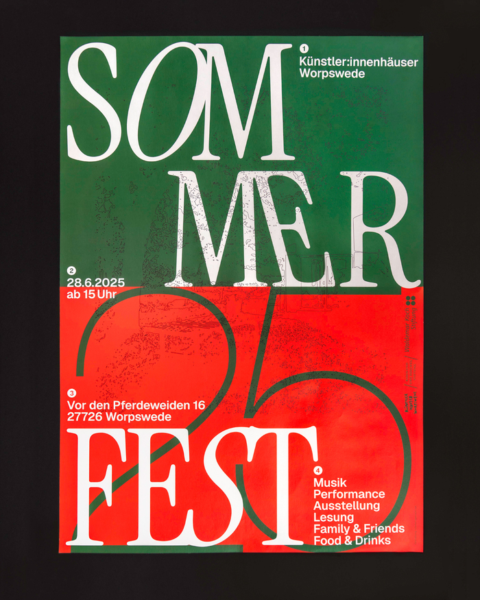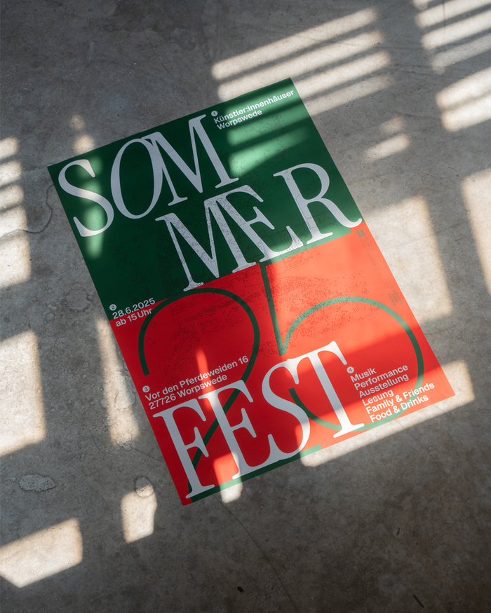 Poster design for the fifth summer festival of Künstler:innenhäuser Worpswede. I worked with layers to connect illustration, typography and color. The bright green and orange create a vibrant contrast, inviting viewers to explore and engage with the design’s rich and varied facets.
