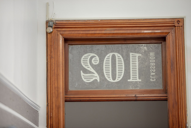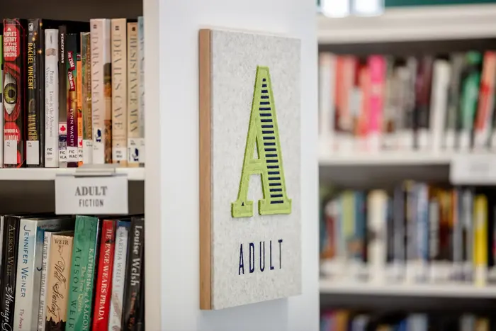The signage and wayfinding system drew inspiration from late nineteenth- and early twentieth-century academic traditions. Referencing felt banners and pennants associated with school pride, the team created sectional markers – adult, children and youth – to identify the book stacks. Brim Narrow was used prominently across these elements, as well as for room numbers applied as cut vinyl to interior transoms. The accompanying condensed gothic is Knockout No. 27.