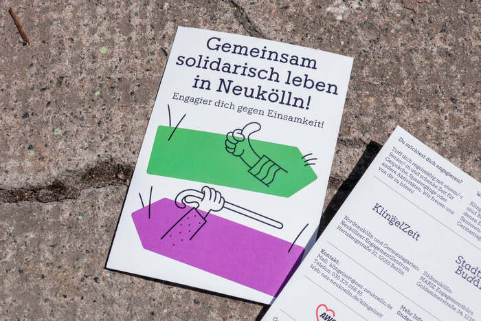 Studio Ugly created the visual identity for the social campaigns Stadtrand-Buddies and KlingelZeit. These two projects were initiated by AWO Berlin Kreisverband Südost and Neuköllner Engagement Zentrum, and aim to help lonely senior citizens in Berlin-Neukölln by supporting sociable activities with neighbors and volunteers.
