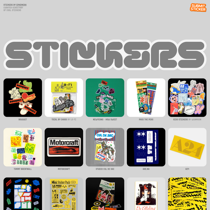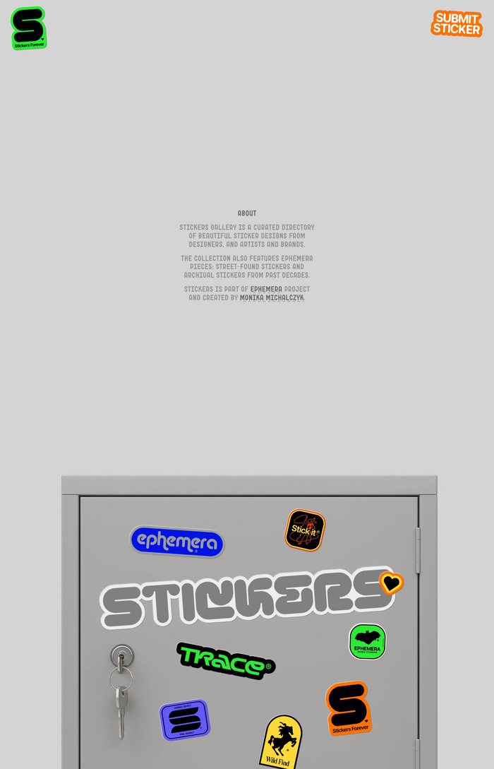 Stickers Gallery is a directory of stickers from brands, artists, designers, and archival sources, designed and curated by Monika Michalczyk. The visual identity uses bold, label-style type and sticker-inspired elements across the interface to reinforce the project’s theme.