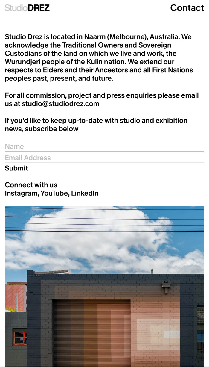 Studio Drez's portfolio website was designed by M.Giesser and developed by Sam Morgan, using the fonts Melange Grotesk Regular and SemiBold.