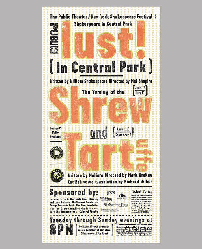 Shakespeare’s Taming of the Shrew was presented by the New York Shakespeare Festival/Public Theater at the Delacorte Theater in Central Park from August 10th through September 5th, 1999, together with Molière’s Tartuffe.