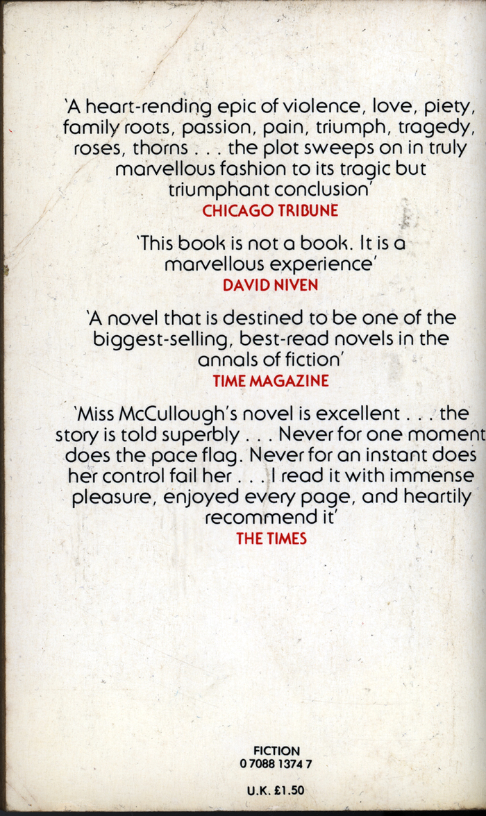 In the rugged Australian Outback, three generations of Clearys live through joy and sadness, bitter defeat and magnificent triumph, driven by their dreams, sustained by remarkable strength of character... and torn by dark passions, violence and a scandalous family legacy of forbidden love.