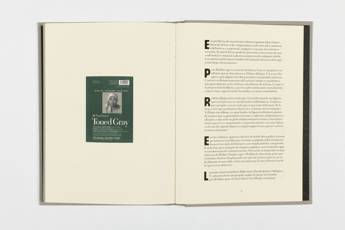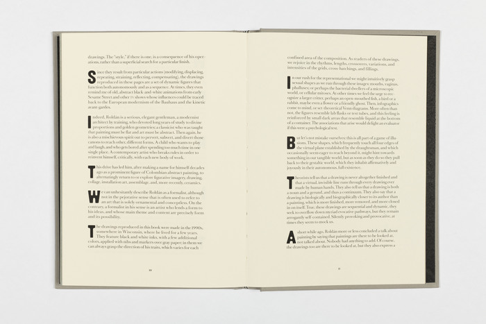 Book about the work from Colombian artist Luis Roldán with black-and-white pen drawings. Designer Nicolas Consuegra of Postscript used Maroni Regular for titles next to Romain BP Headline (see SangBleu OG Serif) for running text. Big Maroni Initials are used throughout the text, paired with the serif typeface.