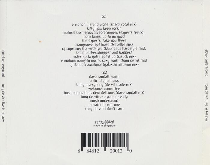 Tony de Vit’s recording of a gig in Tel Aviv’s Allenby 58 club was the first volume in the Global Underground series. Newcastle-based Boxed issued a total of twenty live DJ mix albums until 2001. Subsequent albums were released by Global Underground Ltd.