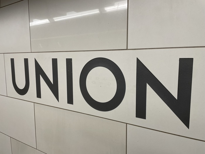 Toronto Subway is a geometric sans-serif typeface designed for the original section of the Toronto Transit Commission’s (TTC) Yonge subway. The typeface and TTC logo were developed during the construction of Line 1 Yonge–University in the 1940s, perhaps by draughtsman Philip Butt, but the original designer has never been determined. The font is a distinctive rectangular font composed of capital letters etched into the tiles of Toronto subway stations opened between 1954 and 1974, as well as on signs.