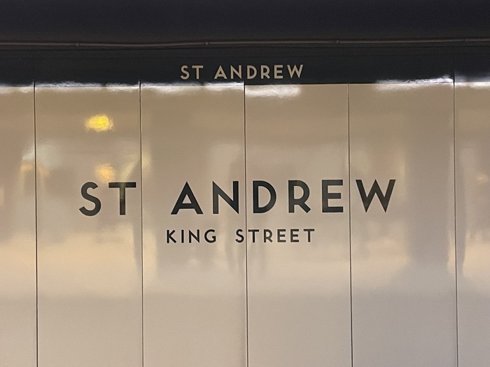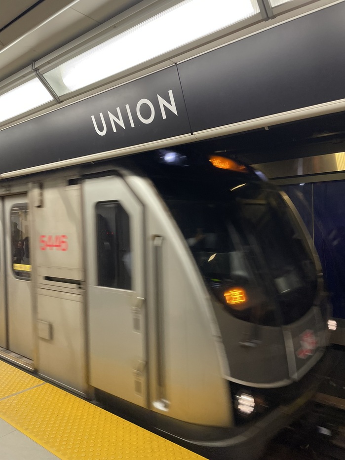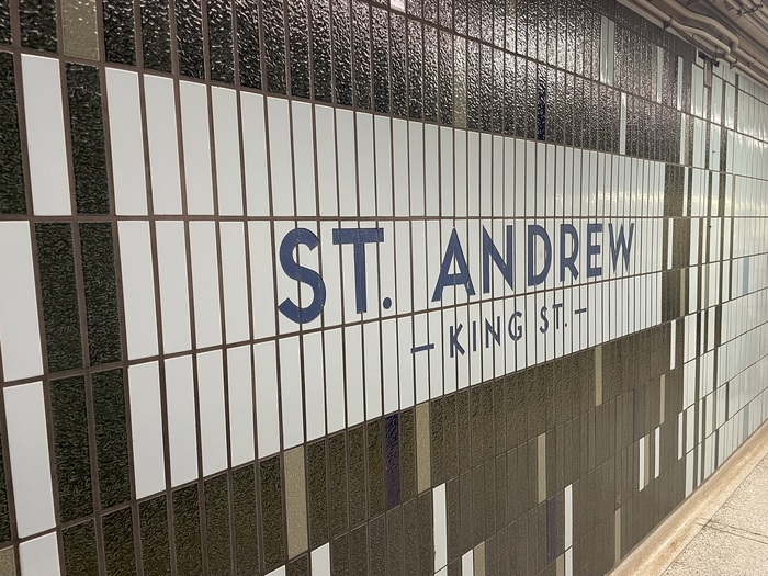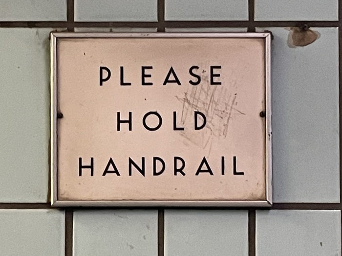 The Union station signage shown is from the 2014 renovation and expansion. The Eglinton station signage is original to 1954 and is a lighter weight used this way only in one other station. The exit sign is also a first use from 1954. The St Andrew station and “PLEASE HOLD HANDRAIL” sign are from the first line extension in 1963.