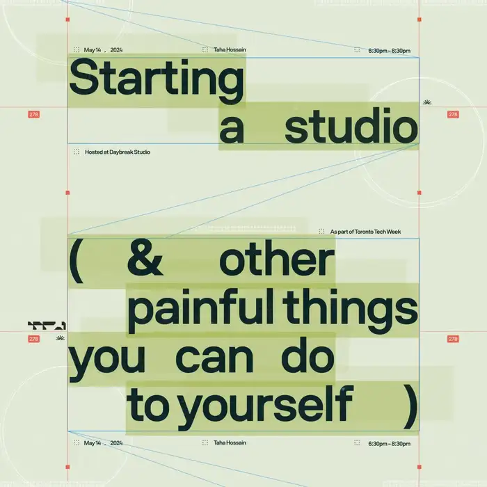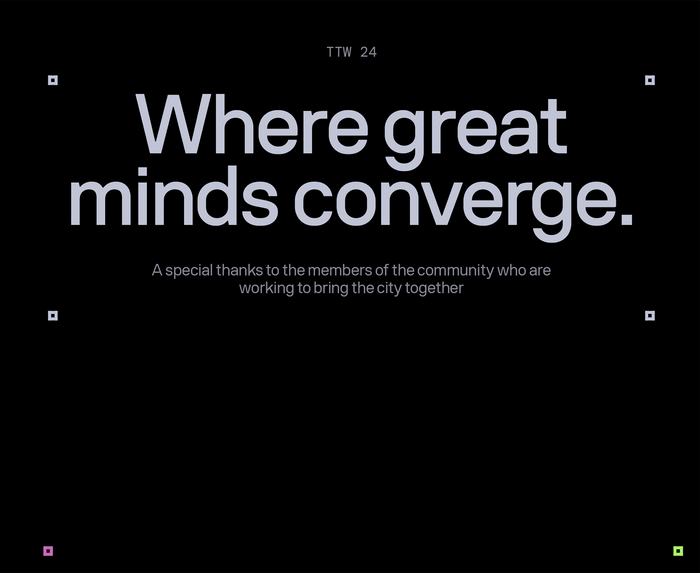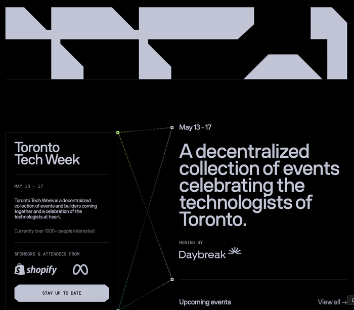 Toronto Tech Week is a decentralized collection of events celebrating of the technologists of Toronto. Hosted by Daybreak Studio, it took place in May 2024. The typography uses Volksans, supported by DM Mono.