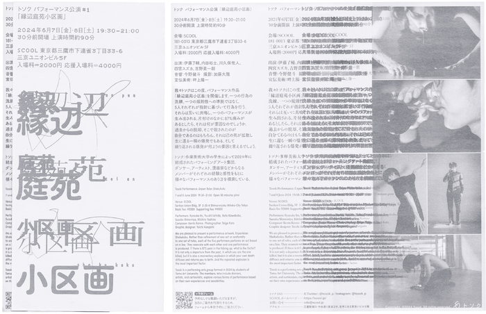 Enpen Teien Shokukaku (縁辺庭苑小区画; “A small plot in a peripheral garden”) was a performance by the student group Tosok from Tama Art University in Hachioji, Tokyo. The event took place at SCHOOL in Mitaka, Tokyo. I designed the poster and flyer for the performance, featuring a layout that mixes an extensive variety of fonts.