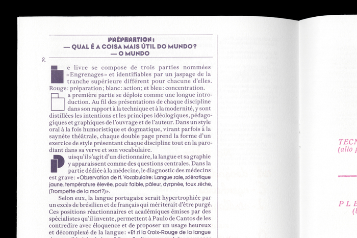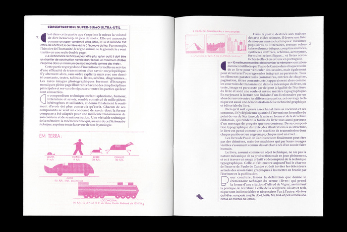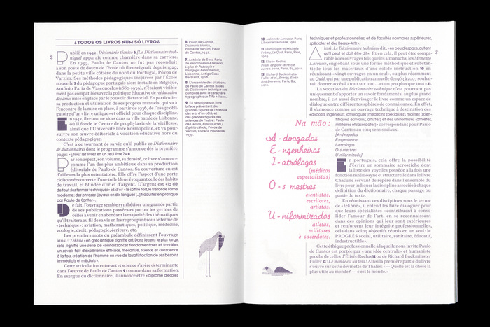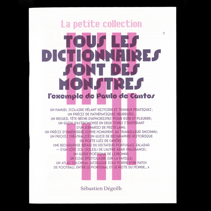 Richly illustrated and printed in two colors (purple and pink), Tous les dictionnaires sont des monstres (“All dictionaries are monsters”) is a text by Sébastien Dégeilh. It details Paulo de Cantos’ approach through a dictionary that is surprising both in the texts it contains and in the graphic and visual forms used, demonstrating great inventiveness and audacity for the time. Paulo de Cantos’ work remains little known to lovers of graphic design and book arts, despite his iconoclastic, avant-garde, and prolific output.