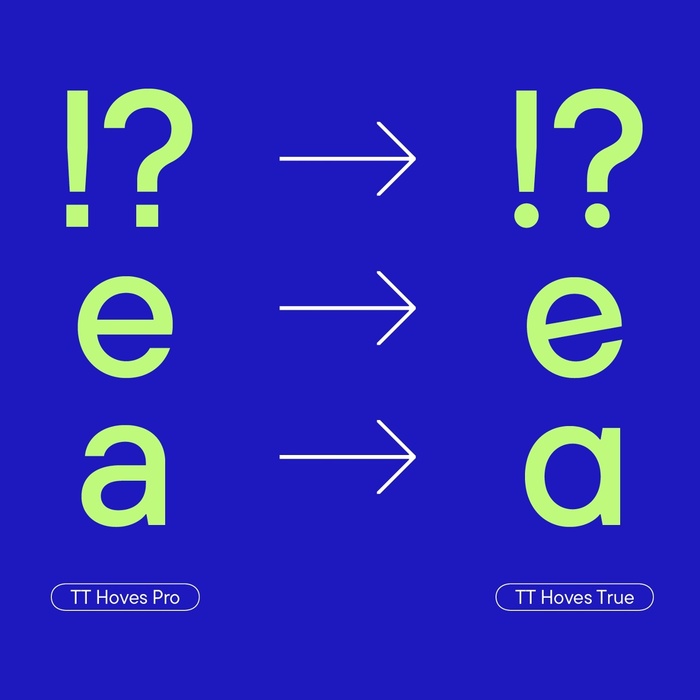 Source: truedigital.co.uk License: All Rights Reserved. The custom version named TT Hoves True is distinguished by round dots, an angled e, and a schoolbook a.