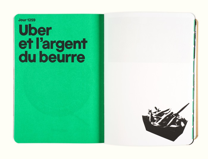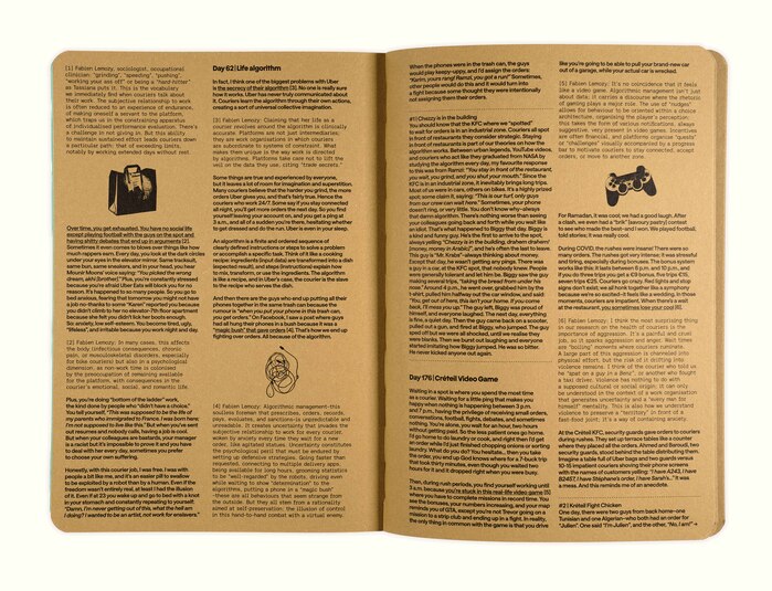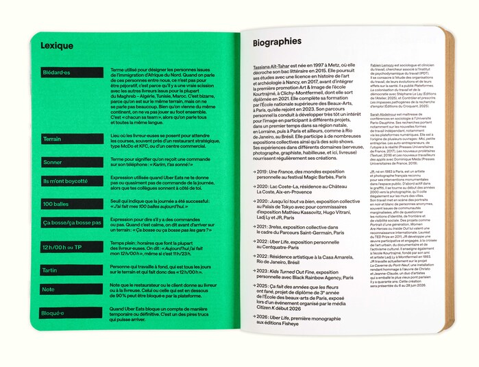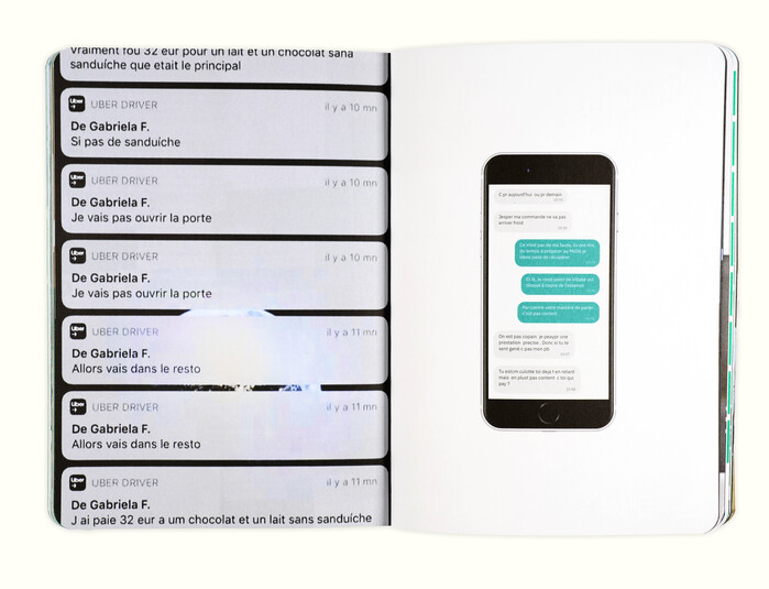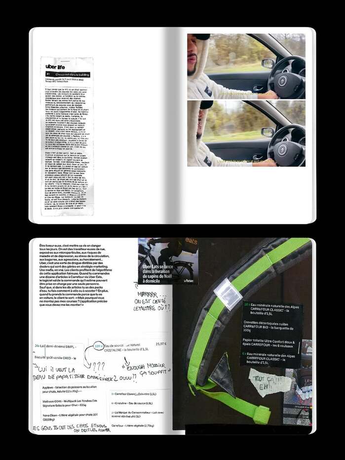Blending imagery, personal accounts and sociology, Uber Life recounts the five years photographer Tassiana Aït-Tahar spent working as an Uber Eats delivery driver. Set against a backdrop inspired by internet culture, the book features a collection of photographs, collages and scans of various objects – a veritable logbook documenting her daily life and that of her fellow delivery drivers.