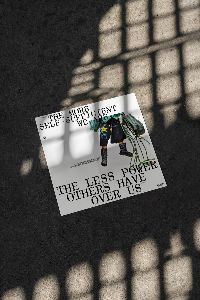 URGE is a container brand where content is the true protagonist. It relies primarily on typography – using Aether Mono and TWK Lausanne – as message transmission is its main objective. The brand’s limited color palette is designed to be versatile, allowing combinations to adapt across various formats and surfaces without losing identity. Aether Mono, with its distinctive character, makes the branding highly recognizable, reinforcing the idea of doing more with less. The brand communicates responsibly and consciously, extending this philosophy to the production of physical pieces, as well as the technologies and creators it collaborates with – opting for recycled, upcycled, multipurpose, or functional materials.