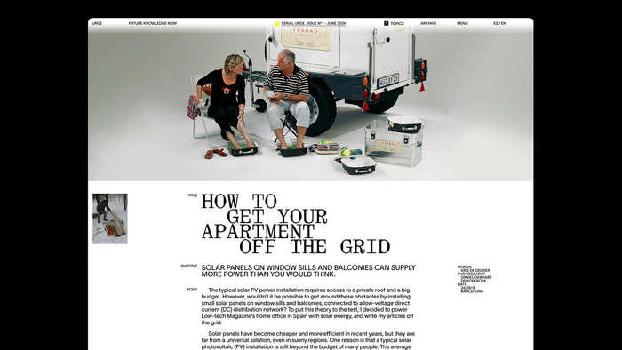 URGE branches into multiple touchpoints: “Serial URGE” – a philosophical magazine exploring social change through knowledge and debate –, “Hub of URGE” – an itinerant workshop space for hands-on community learning –, “Cantenna” – a DIY kit that turns any can into a Wi-Fi amplifier, promoting both technology and manual craftsmanship –, “URGE.net” – a digital archive housing curated content on self-sufficiency and future-forward technologies – and “The Humans of the Future” – a speculative photo report envisioning a community aligned with URGE’s philosophy.
