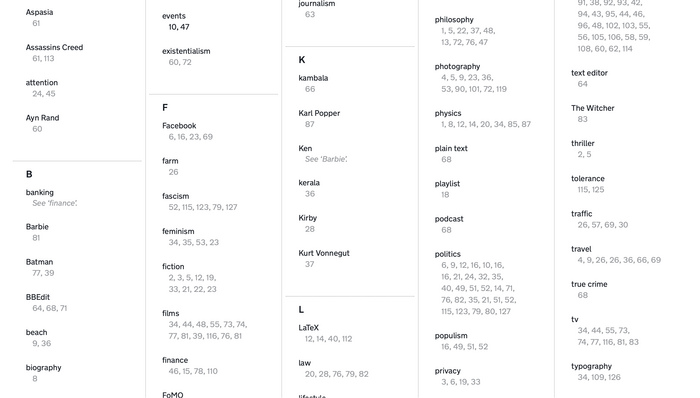 Side notes for essays are implemented next to the main body copy on wide screens and interspersed beneath paragraphs on mobile. These along with all UI elements, like the menu, are set in New Transport by A2-TYPE, including, in some cases, entire pages e.g. the ‘Index’ page and reading list (both pictured separately).