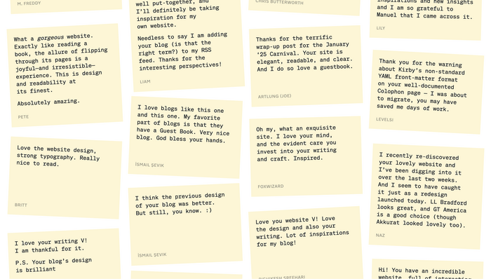 The use of Söhne Mono introduces a playful element to the website’s Guestbook (pictured) where it is used on sticky notes that carry messages from the website’s visitors.