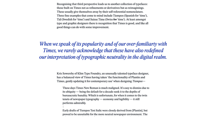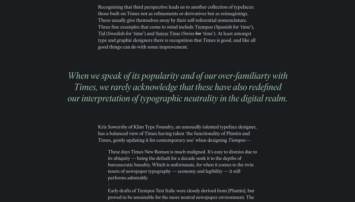 Tid by Letters from Sweden is used as the primary typeface. It allows for easy reading as well as effortless skimming, particularly considering the website frequently carries long form content. Uniform letter widths across weights in Tid allow for not only predictable design with dynamic layout changes (via the menu) but also a justified setting (pictured) for readers who might prefer it. Justification also indents paragraphs instead of adding spaces between them.