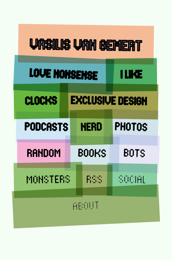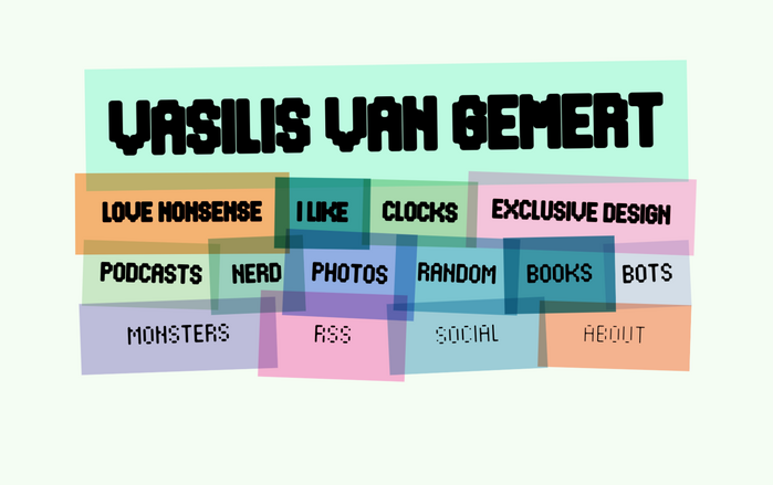 His homepage is a collection of links, set in Electric Blue by Font Spectrum, designed by Daniël Maarleveld and Edgar Walthert and released via Future Fonts. The site employs a hover effect that utilises the multiplexed weights of the variable font, layering a lighter weight over the current one to create an inline effect. As the CSS wizard he is, Vasilis has programmed the colours to subtly shift over time or randomly recolour upon page reload. The website is fully responsive and will adapt to different screen dimensions.