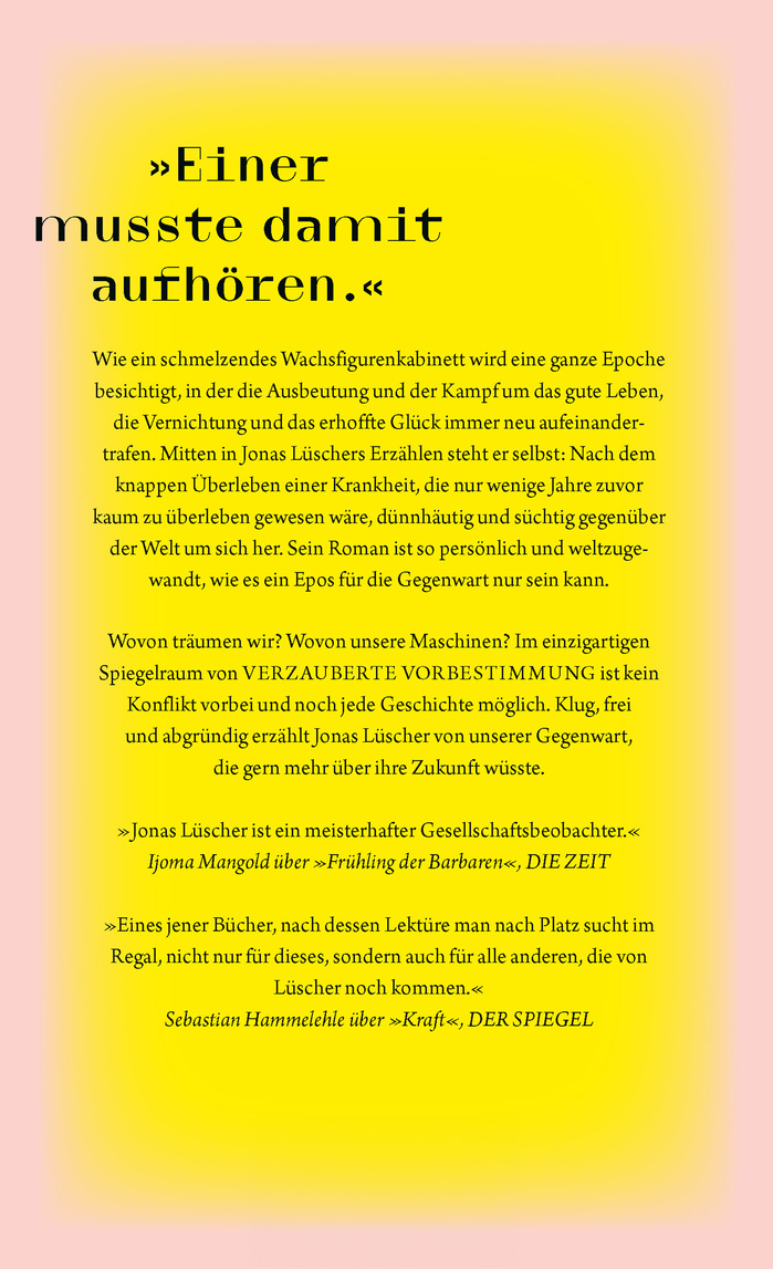 An Algerian soldier is caught in the first German poison gas attack, decides that someone has to stop it, gets up and leaves. In the Cairo of the future, a stand-up comedian observes an android laughing at her jokes. A Bohemian weaver is replaced by an automated loom, steals a hammer and attacks the machine. What do we, the people of capitalism, dream of, and what do our machines, which are increasingly rising up against us, dream of? In the unique mirror space of this novel, no conflict is over and every story is still possible. Clever and mad, funny and sharp, Jonas Lüscher's story is at the height of his art.