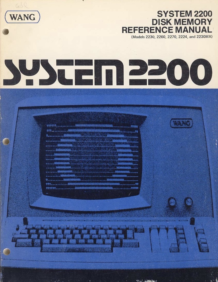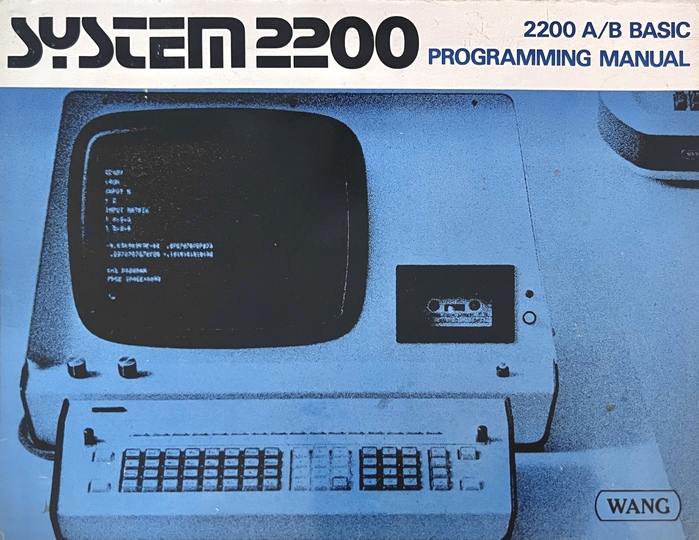 The Wang System 2200 was a series of desktop minicomputers with a built-in BASIC language, introduced in the early 1970s before the advent of popular microcomputing. The printed documentation for this line of systems employed a couple different design languages, but the style shown here with this typography was in consistent use through at least 1977’s PCS-II.