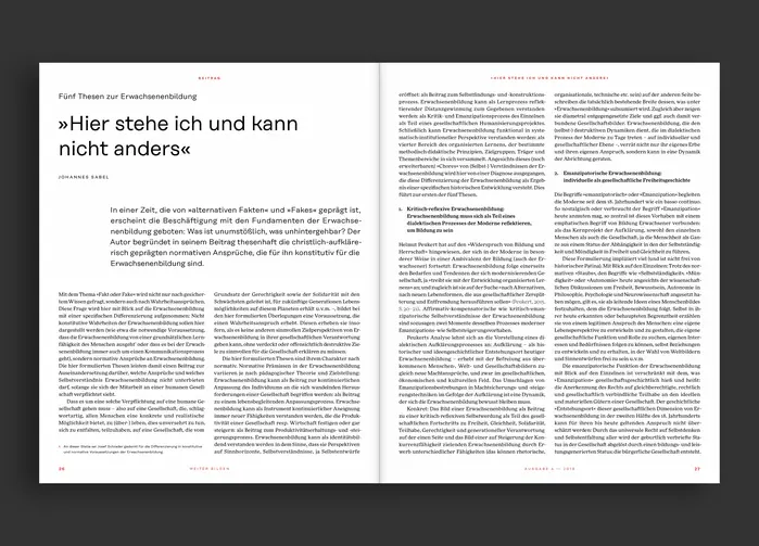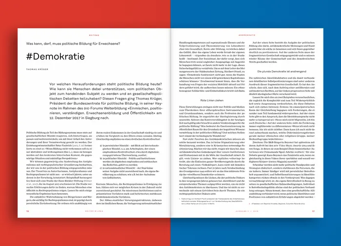 weiter bilden. DIE Zeitschrift für Erwachsenenbildung is academically rigorous and practice-oriented – serving as both a magazine and a medium for reflection. The journal is published four times a year by Deutsches Institut für Erwachsenenbildung – Leibniz-Zentrum für Lebenslanges Lernen (DIE), Bonn.