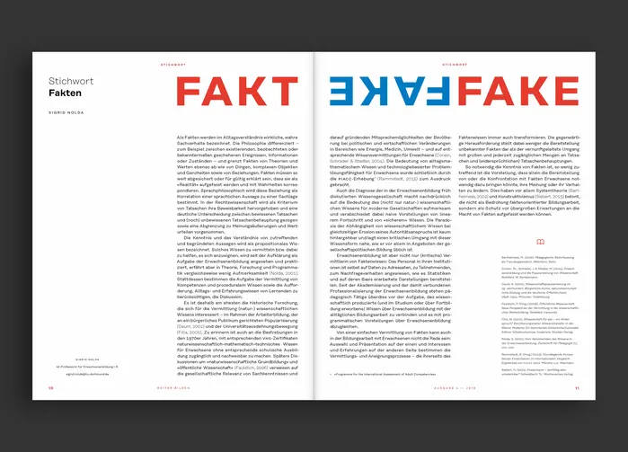 Each issue focuses on a specific theme from the field of adult and continuing education. Shown here are the issues 2/2018, “Debatte”, and 4/2018, “Fakt Fake”.
