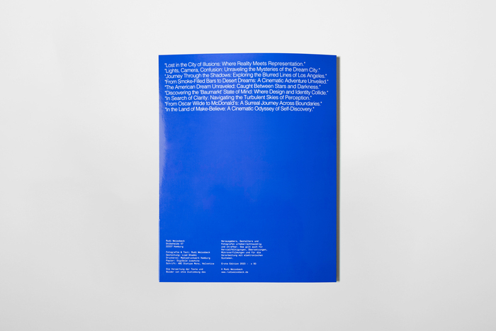 Photobook design for the artist Rudi Weissbeck, featuring a travel journal and a short story, the book questions the essence of a classic road movie, while also embracing it. It is inspired by a journey along the American West Coast in 2015.