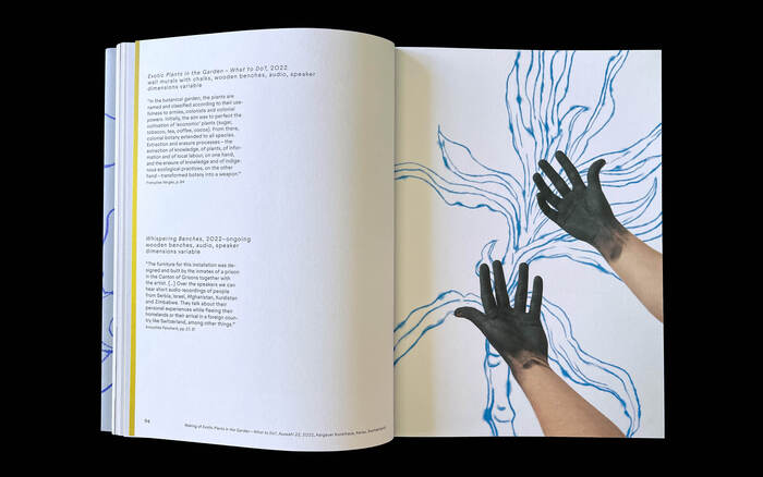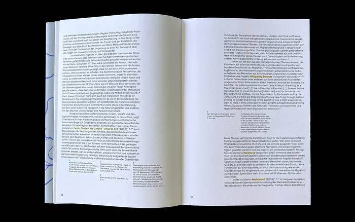 The publication was designed by Megi Zumstein, who selected the Juneau font family by Phillip Neumeyer for the typography. This typeface combines geometric construction with grotesque characteristics, uses circular forms, and references old metal grotesques. Since the typography remains subordinate to the photographically documented works, it is primarily used in smaller text sizes. Juneau’s economical proportions and open stroke endings support readability at these smaller scales. For headings, increased letter-spacing makes them distinguishable without requiring significantly larger font sizes. The typographic approach aligns with the publication's overall production and maintains a balance with the artistic content.
