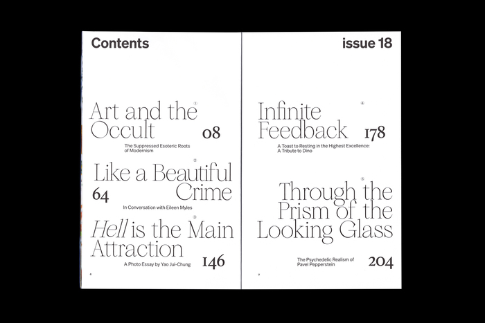 The issue also includes an epic feature on Hilma af Klint and the suppressed occult roots of modernist art. Taipei artist Yao Jui-Chung contributes a photo essay documenting animatronic depictions of the Chinese concept of hell, as seen in Daoist temples in Taiwan and Singapore. Yan Jun reflects on the life of Taiwanese noise music pioneer Dino (Liao Ming-He), who passed away in 2022. Also featured is an interview with artist Pavel Pepperstein on the influence of children’s literature and hallucinogenics in conjuring his surreal futuristic landscapes—a style he calls “psychedelic realism.”