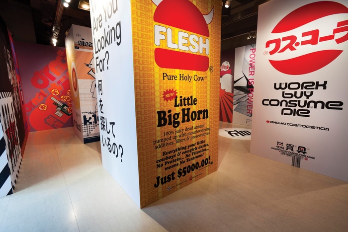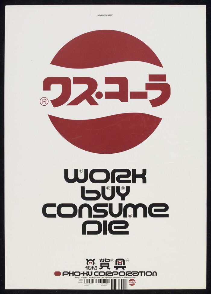 ‘Work Buy Consume Die’ is the slogan of the imaginary Pho Ku Corporation invented by The Designers Republic, a Sheffield based graphic design agency. Disenchanted with corporate driven consumerism in the 1990s, but acknowledging their role as a brand agency in the process, The Designers Republic devised an anti-corporate identity to counter the forces of global branding. The design is inspired by Japanese graphic design and also subverts the Pepsi Cola logo as a comment on the force of global branding.