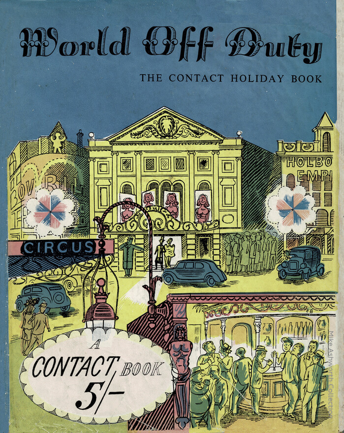 The Contact Books were a short post-WW2 series of factual books that looked a variety of topics this edition, from late 1947, was on ‘holiday activities and mood’. The volumes were issued at about four-monthly intervals and, as well as adverts, contain many illustrations and photographs often by well-known artists and designers. This dustwrapper or book jacket is by Edward Bawden and shows a variety of pleasurable activities around town.