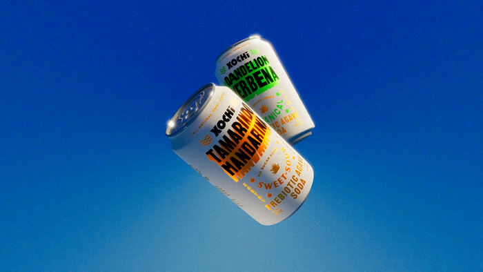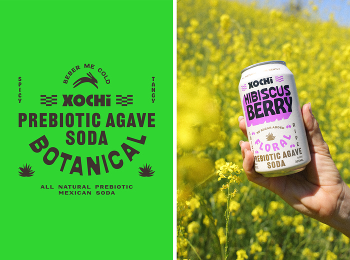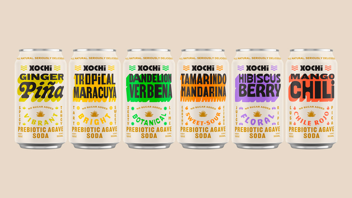 Packaging design for Xochi Prebiotic Agave Soda made with 100% natural ingredients, respecting the traditions surrounding aguamiel.