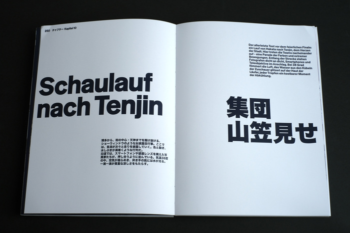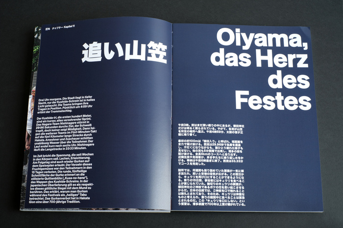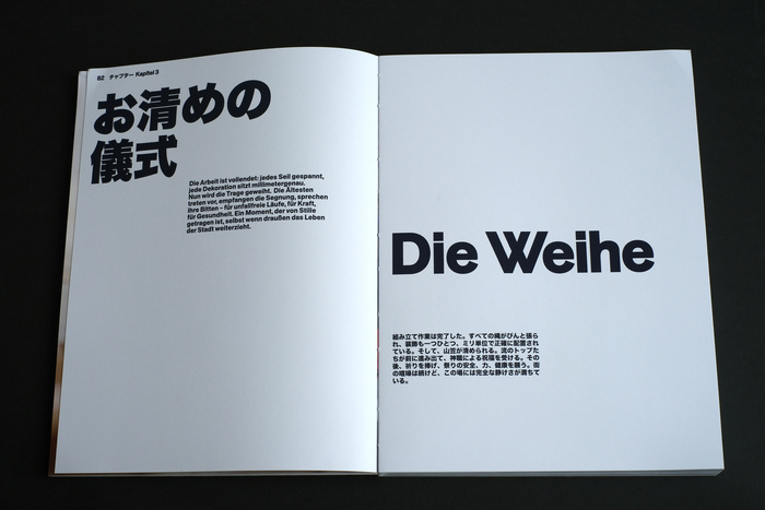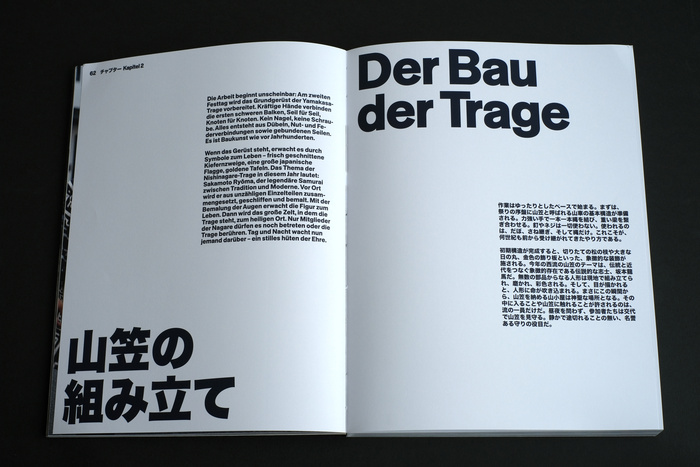 In the German-Japanese typography, the typeface collection Tausend from Fontwerk plays a central role and Gabriel Richter was also involved in its development. Its compactness and slightly slanted ends correspond strongly with the structure of Japanese Kanji and their dynamic strokes. Tightly spaced letters create a feeling of density and cohesion, as exemplified by the groups of men carrying their palanquin. In combination with the Japanese typeface Hiragino Sans from Screen Graphic Solutions Co., whose subtle weight gradations could be precisely matched to Tausend, a captivating typographic dialogue was created – without striking effects or cultural simplifications.