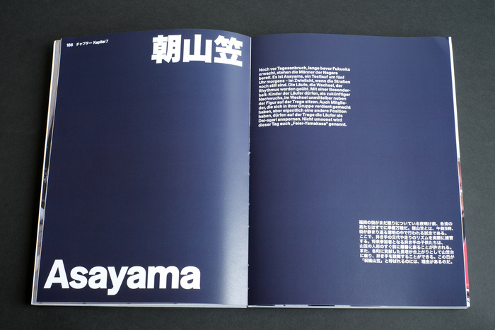 Just as the stretcher is carried through the old town of Hakata, the explanatory texts take up different positions on the double pages.