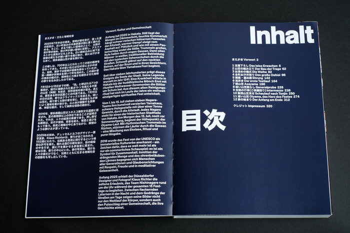 Yamakasa was designed by Klaus Richter and his son Gabriel Richter. They conceptualized the book as a spatial and movable object. The headlines and texts move across the pages like the Yamakasa carriers through the city. The open thread stitching is not only an aesthetic detail, but a deliberate reference to the ropes and cords that hold the Yamakasas together. With around 300 pages, the book has a physical presence that conveys the weight and power of the festival.
