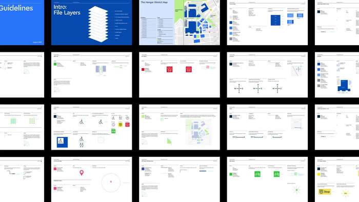 The branding needed to reference the aviation heritage of the site while also addressing the transformation toward an open urban district. For this reason, the stencil typeface Cera Stencil was chosen for the wordmark. Pentagram writes: