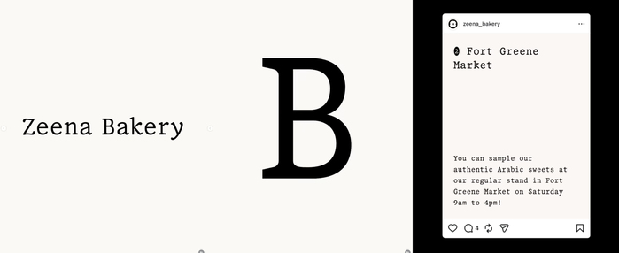 Zeena Bakery’s visual identity, designed by Portrait, uses 00 Wagram Mono Slab by D0UBLE ZER0 Foundry throughout. The typeface appears across the logo, packaging, printed materials, and the website, providing a consistent typographic system.