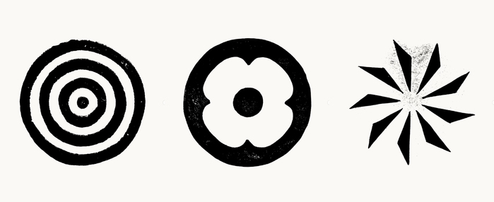 The identity is complemented by handmade linocut ornaments, which introduce texture and contrast alongside the controlled typographic framework.