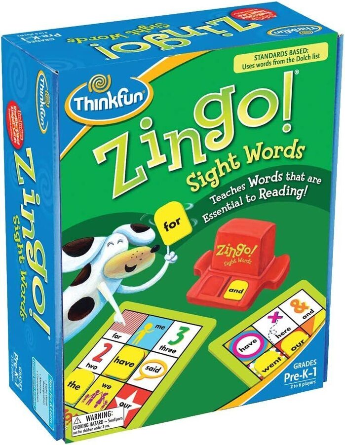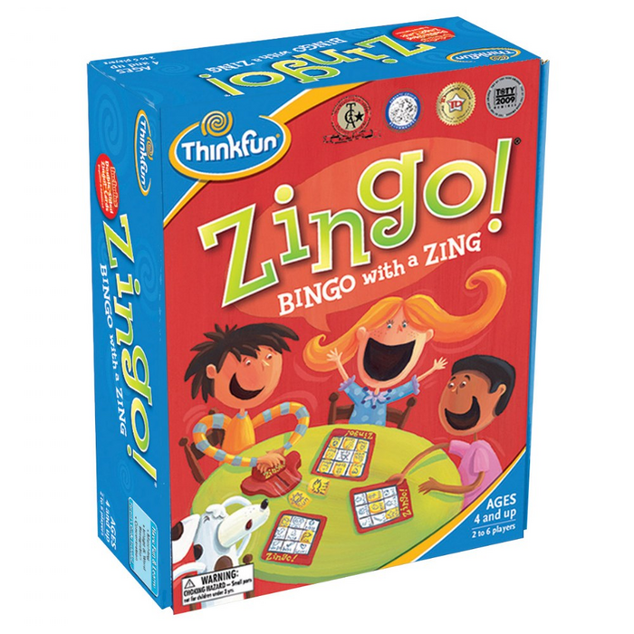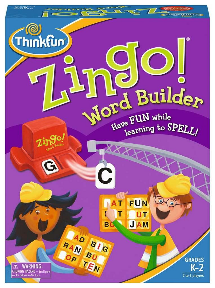 Zingo! is a series of Bingo-like card games by ThinkFun. Launched in 2002, it aims to engage kids aged 4 and up in learning and enhancing memory and word recognition skills. Rat Fink Heavy is used for the logo, featuring bouncing letters with contour and gradient fill. The playful slab serif by House Industries is also the primary font used on the boxes across the various editions, including 1-2-3, Sight Words, Word Builder, and Boost.